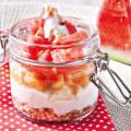 del kiwi, togli il nocciolo all’albicocca, asporta il picciolo alle fragole e taglia tutto a pezzettini. Metti la frutta in una ciotolina, copri con lo yogurt e mescola leggermente. Per ultimo sbriciola un biscotto per l’infanzia (o versa un cucchiaino di biscotto granulato) e cospargi sopra allo yogurt e alla frutta. Servi al bimbo.